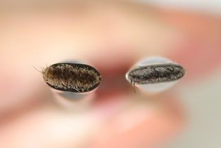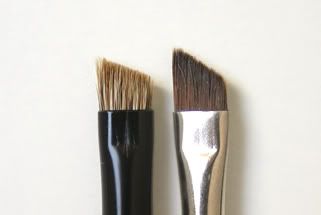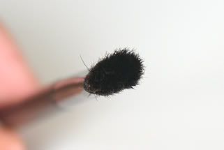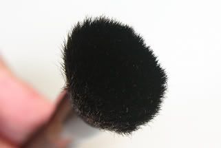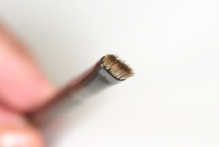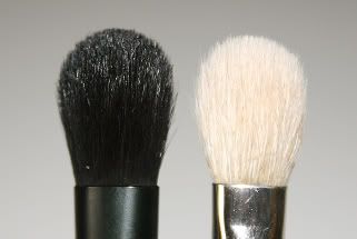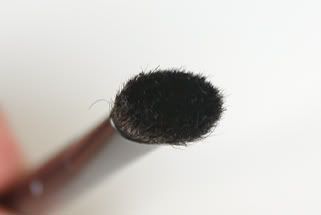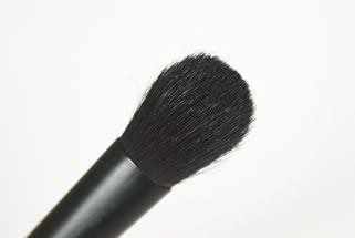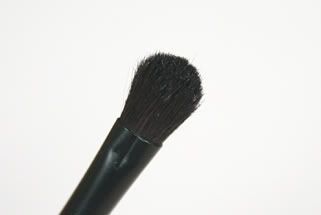 The bigger eyeshadow brush is roughly 10.5cm long made from horse hair. It has a similar shape to the infamous MAC 217 brush (on the right with the silver ferrule) but not quite as rounded. Excellent for applying an all over wash of shadow to the lid, but perhaps not quite so adept at blending as the 217.