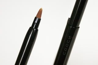 The overall packaging is, as Suqqu always is, absolutely fantastic. The whole thing is presented in a deceptively large black box with a black plastic mold that snugly holds the frosted glass screw top jar and accompanying retractable brush. The brush is phenomenal, and, in my opinion, justifies the otherwise high retail price of the whole ensemble.